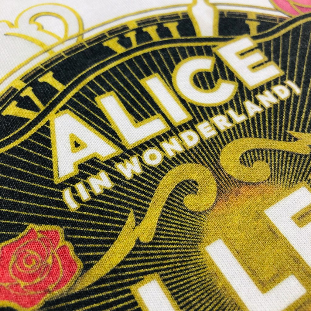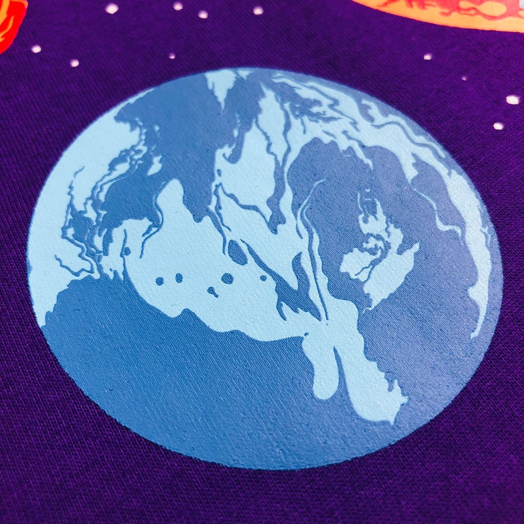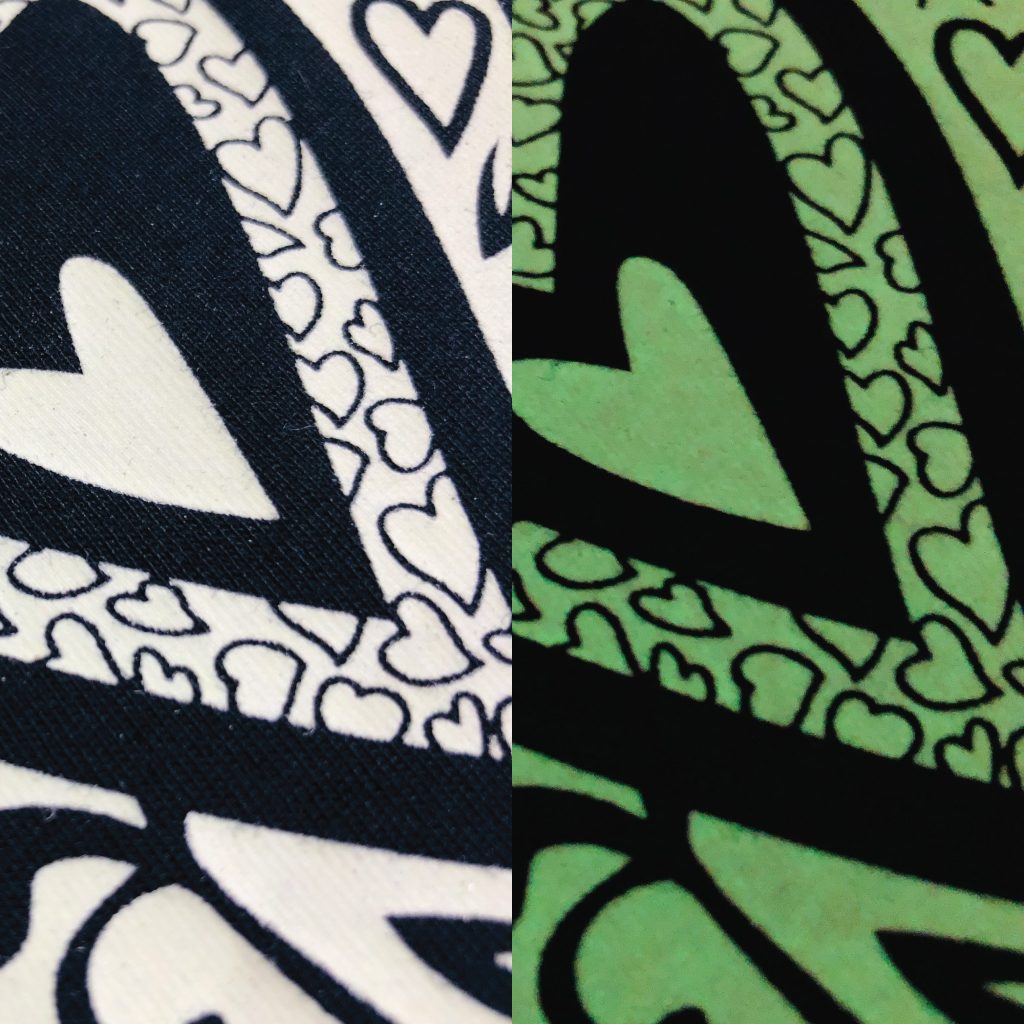 透過絲印技術將夜光漿料覆蓋於服飾上,在漆黑中令圖案更鮮明奪目;一般印刷在較深色的衣物上,可增強對比。