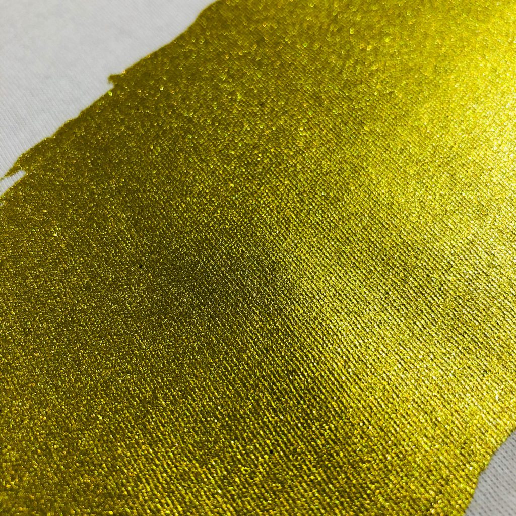 透過絲印技術將金屬漿料會覆蓋於服飾上;金屬色令圖案於服飾上呈現的效果更突出和更具美感
